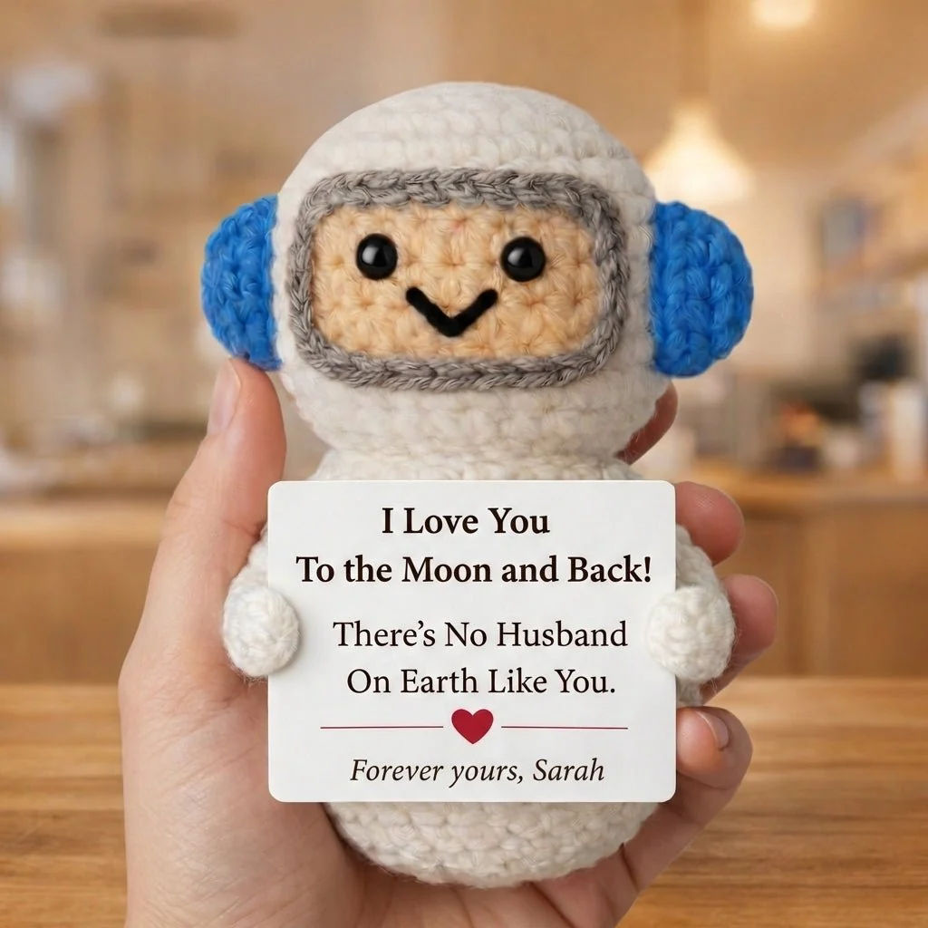A small gift with a huge message. This adorable crochet astronaut holds a personalized card made just for your person.